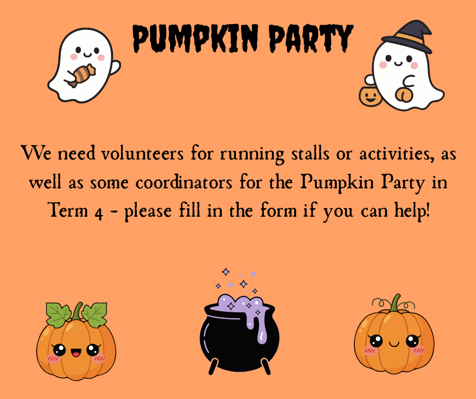 Pumpkin Party – if you are able to help with the planned October/Halloween event please fill in this form: https://forms.gle/Bkn873rUKTubkJPM6